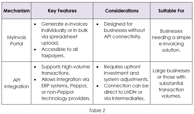 2. API: An API is a programming code to enable direct data transmission between the taxpayers’ system and the MyInvois system. This is ideal for large taxpayers or businesses with substantial transaction volumes.