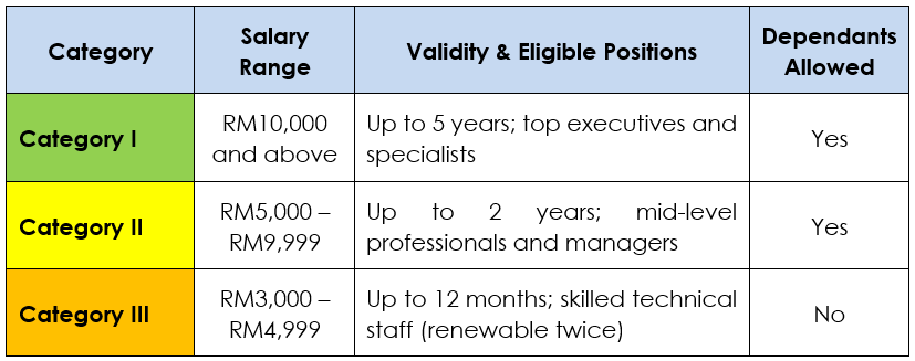 The Employment Pass is the most common permit for foreign professionals and is divided into three categories based on salary and position. The table below summarises the categories, validity, eligible positions, and family-related entitlements: