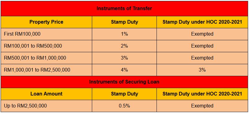 What is it all about. Homebuyers will be able to enjoy full stamp duty exemption on the instrument of transfer for residential properties priced up to RM1 million while for properties that are worth more than RM1 million up to RM2.5 million, 3% stamp duty on the instrument of transfer for the amount that is more than RM1 million. On the other hand, full stamp duty exemption is given on instrument of securing loans. Below is a summary of the above: