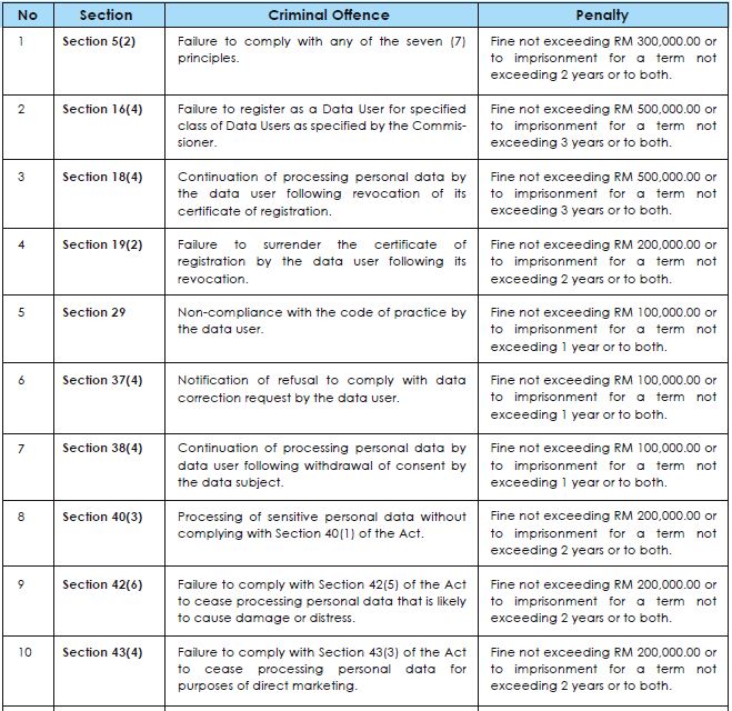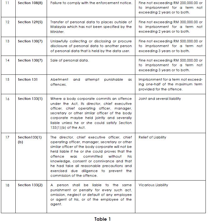 Table 1 illustrates some of the examples which the Commissioner may enforce against the data user for its failure to comply with the Act.