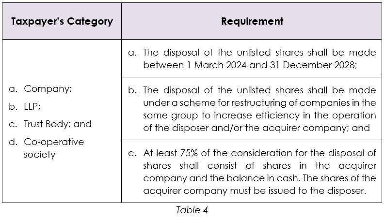 The relevant Order exempts a company, LLP, trust body or co-operative society from income tax on gains or profits from the disposal of unlisted shares in a Malaysian-incorporated company, to an acquirer company which is tax-resident in Malaysia.