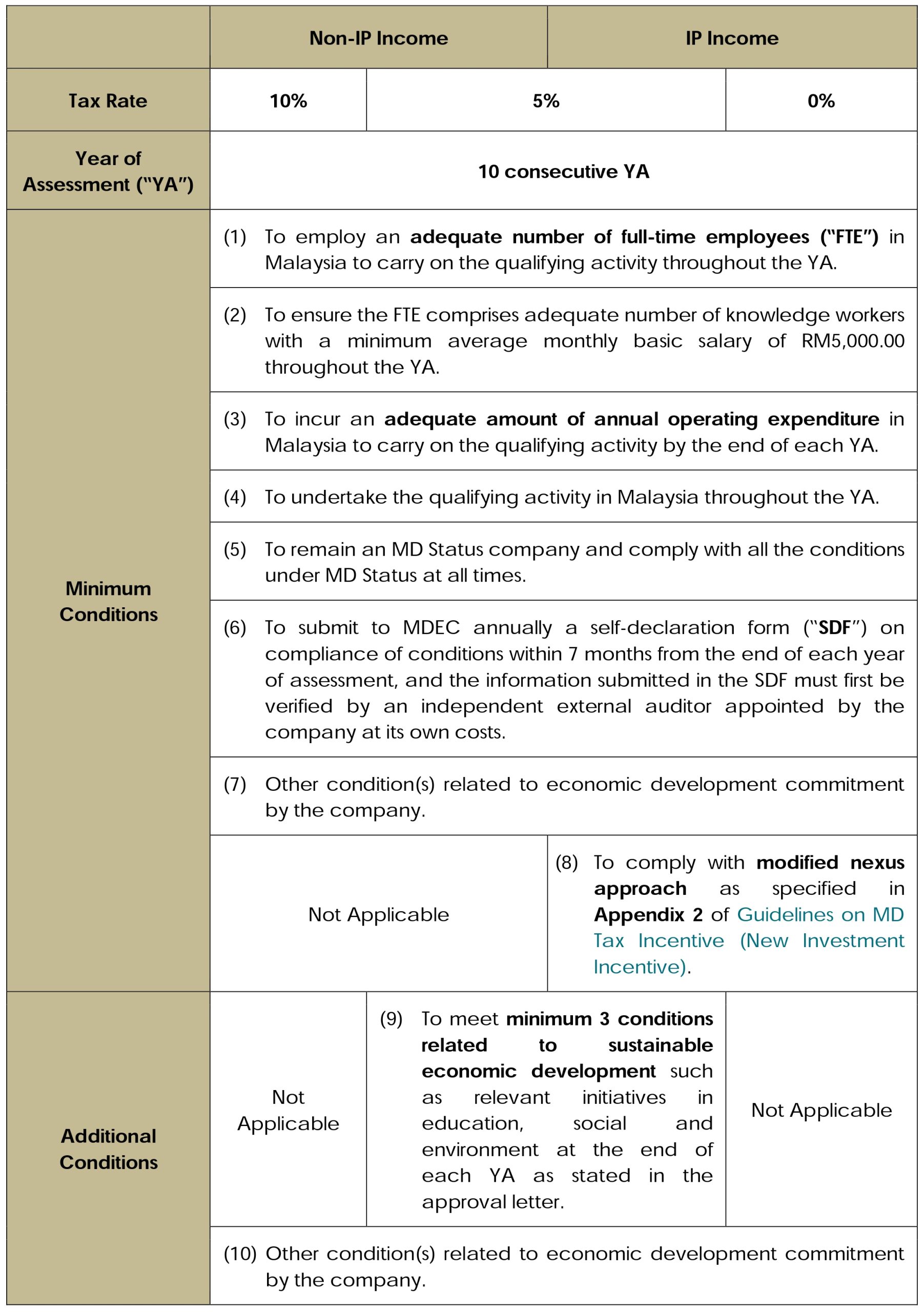 *For non-IP income, the company shall be entitled to enjoy a reduced tax rate of 10% subject to compliance of minimum conditions (1) to (7). If the company complies with minimum conditions (1) to (7) and additional conditions (9) and (10), the company shall be entitled to enjoy reduced tax rate of 5%. For IP income, the company shall be entitled to enjoy a reduced tax rate of 0% subject to compliance of minimum conditions (1) to (8).