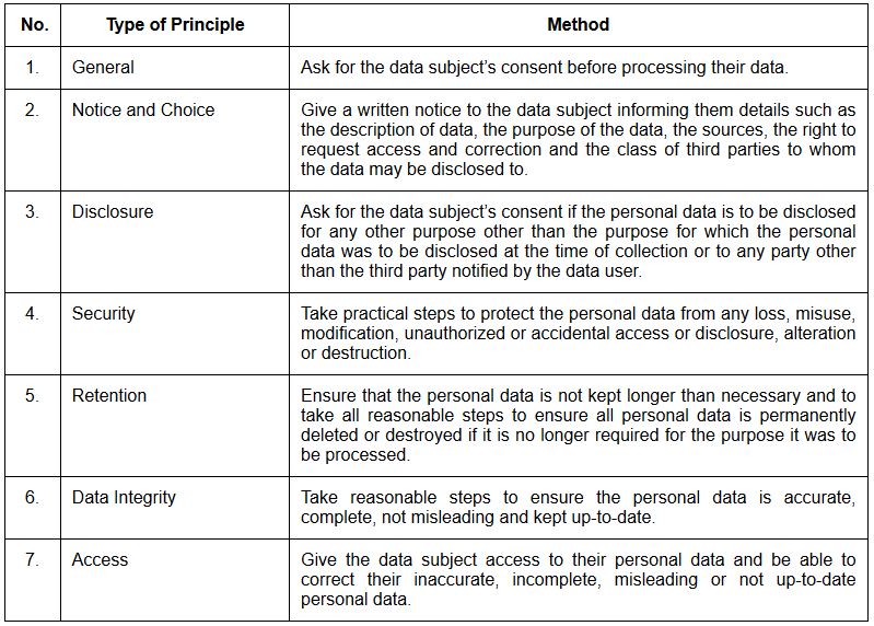 There are seven data protection principles[3] in the PDPA that data users[4] should comply with and they are briefly stated as follows:-