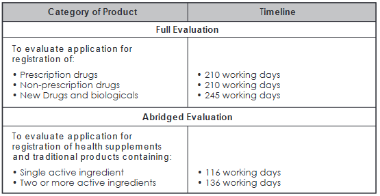 The DCA will charge any costs as it may incur for the purpose of carrying out laboratory investigation/testing prior to the registration of any product. Applications without the prescribed fees will not be accepted and such processing fee is not refundable. The duration required for the product registration is calculated from the date of final and complete submission. The timeline for the product registration of each category is as follows: