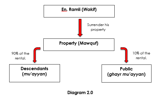 Diagram 2.0 illustrates the simple operational mechanism of Wakaf Zurri. En. Ramli (wakif) surrender his property (mawquf) to his descendants (mu’ayyan) and the public at large (ghayr mu’ayyan). One-tenth (or 10%) of the rental income is allocated for welfare purposes and the remaining nine-tenths (or 90%) of the rental income is allocated to the descendants.