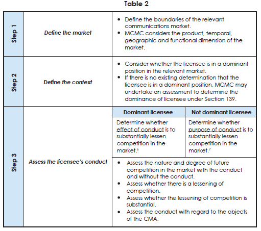 On 11 July 2014, MCMC has issued its Guidelines on Substantial Lessening of Competition (“SLC Guidelines”) which provides the framework to assess a ‘substantial lessening of competition’ which involves a three-step process, as outlined in Table 2[5].