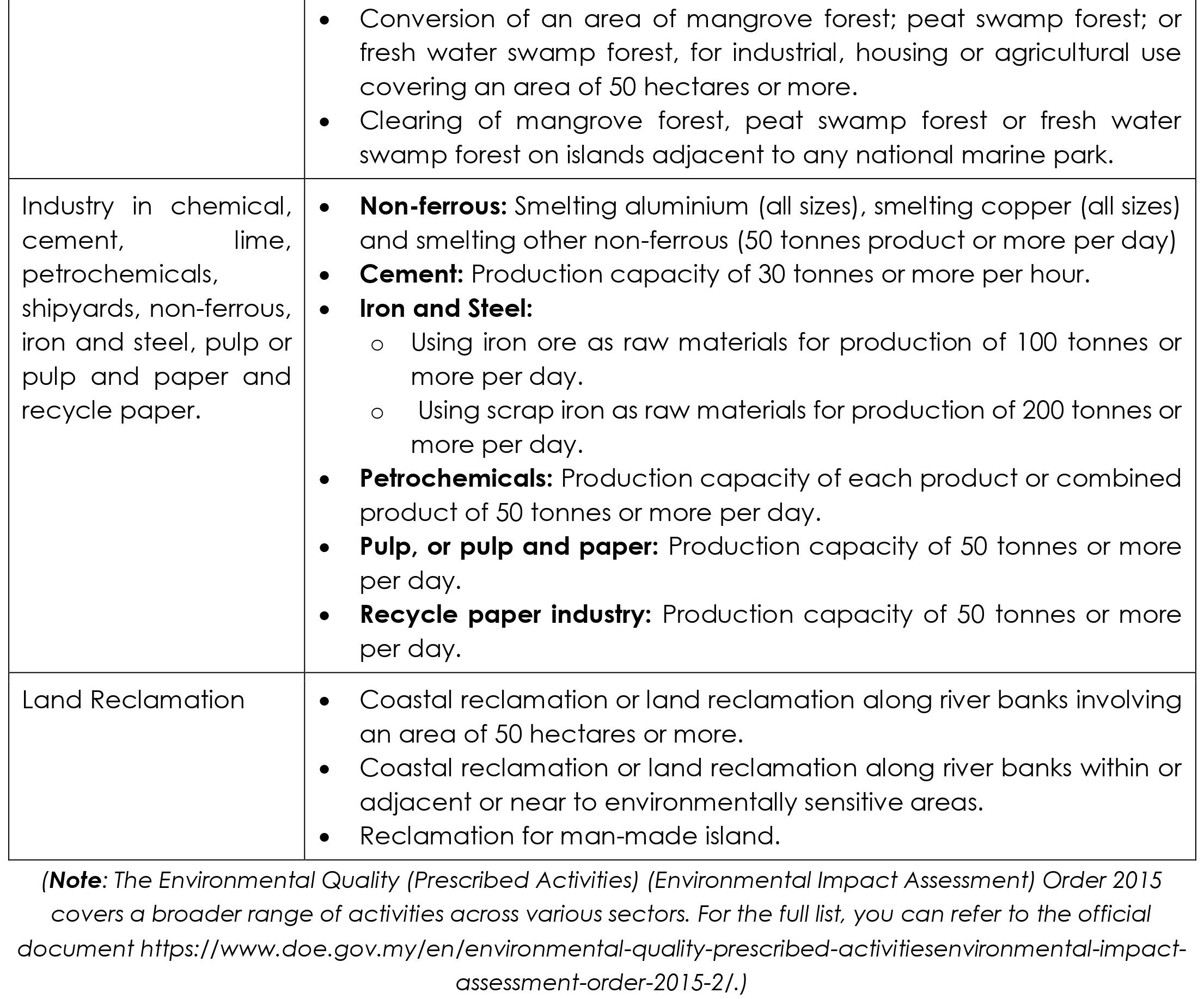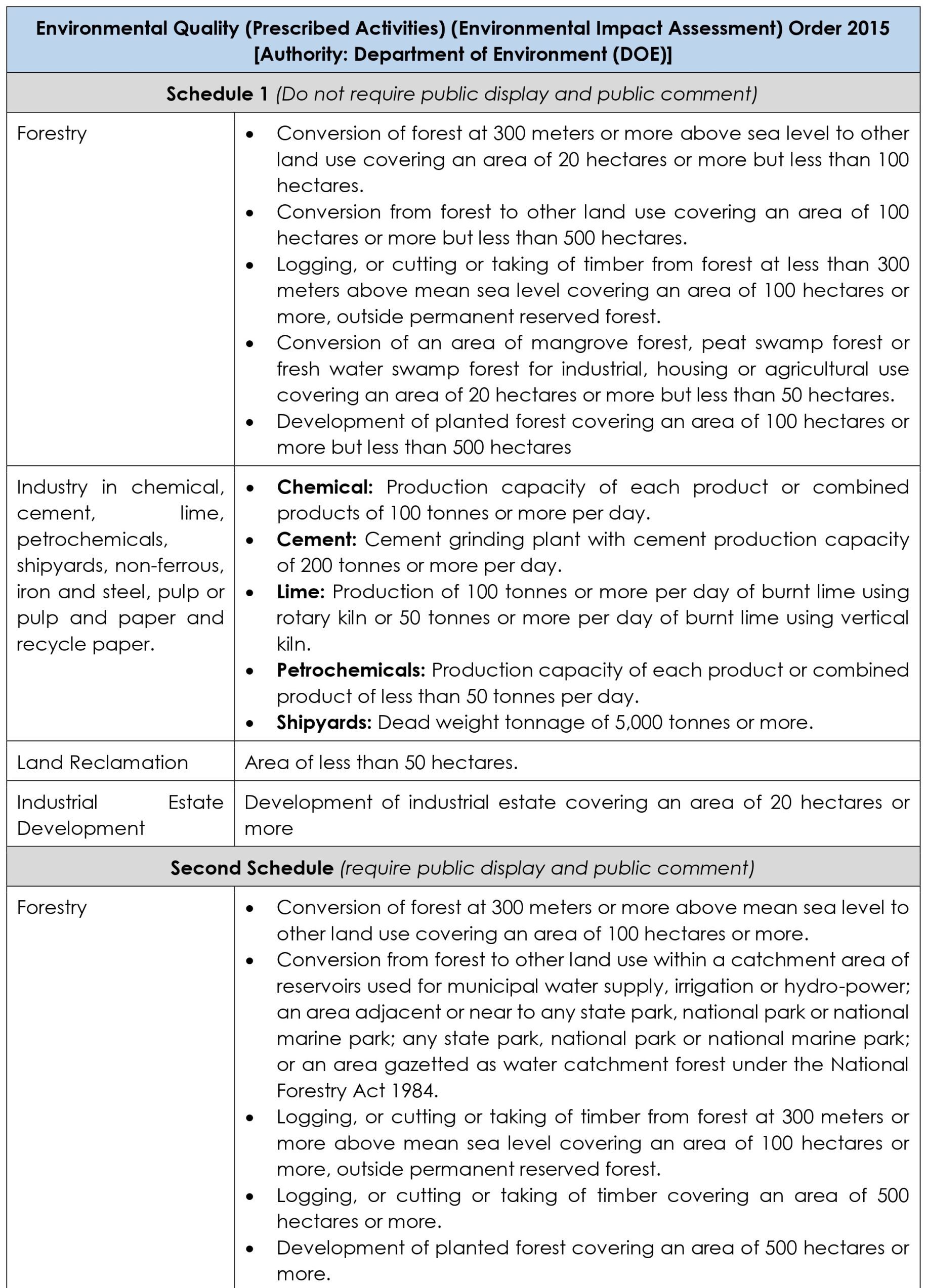 8. Environmental Quality (Prescribed Activities) (Environmental Impact Assessment) Order 2015, Schedule 1 and 2.
