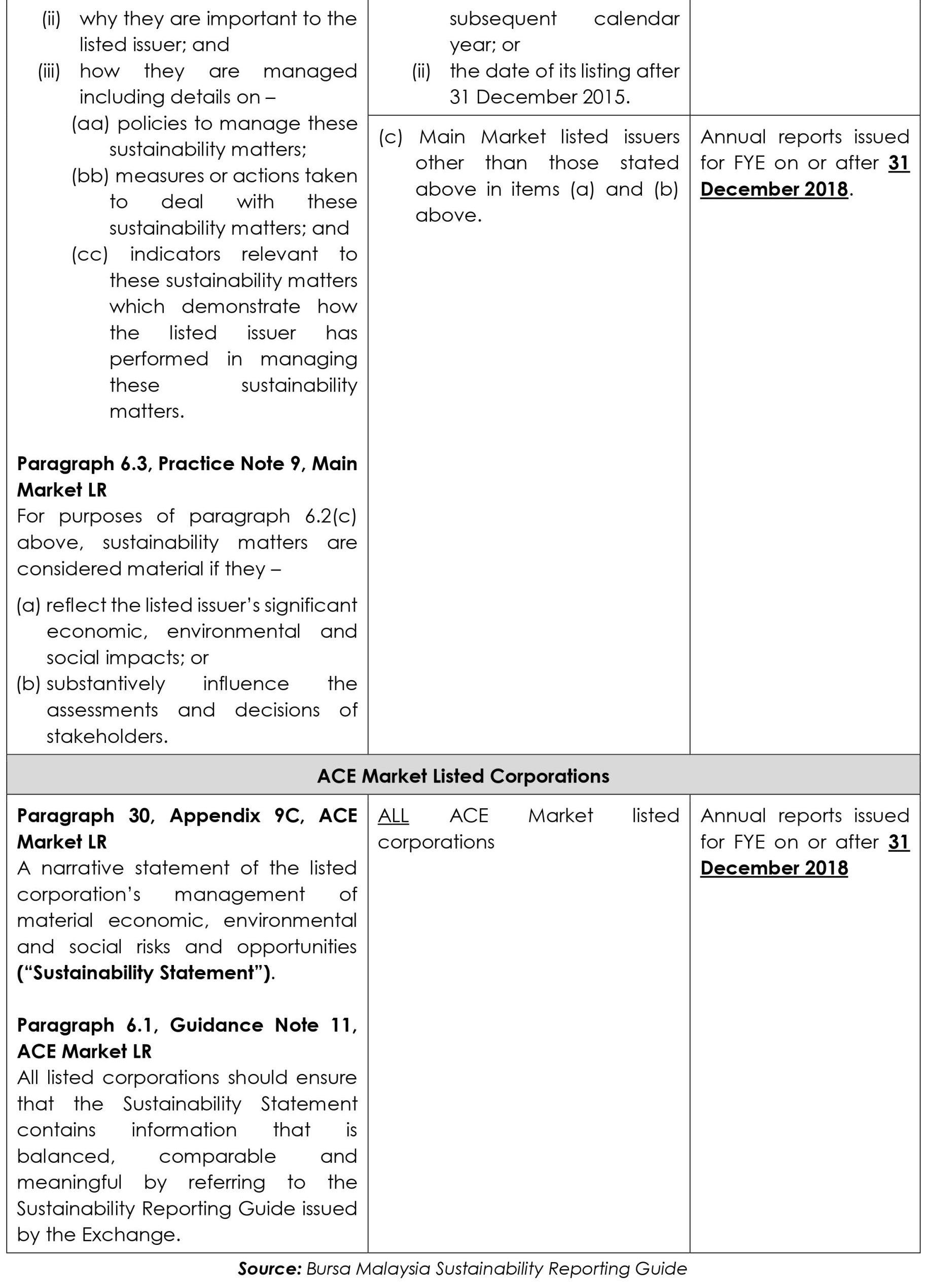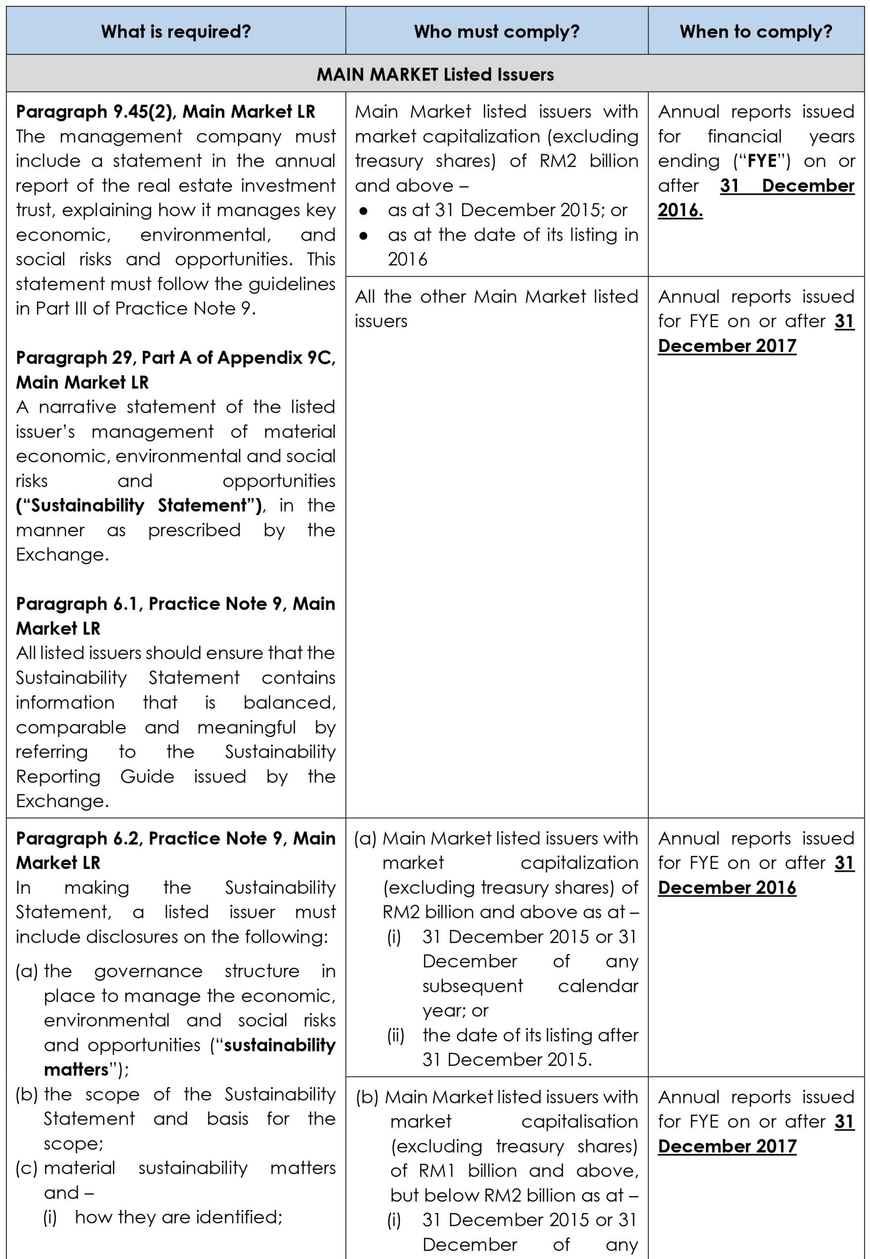 Additionally, the Bursa Malaysia Sustainability Reporting Framework requires publicly listed companies to disclose their ESG activities, risks, and strategies. For industrial land developers, these disclosures ensure that stakeholders, including investors and the public, are well-informed about the company’s commitment to ESG practices. The Listing Requirements require the company to include sustainability-related disclosures in their annual reports. The table below provides an overview of the sustainability-related disclosure obligations as prescribed by the Listing Requirements.