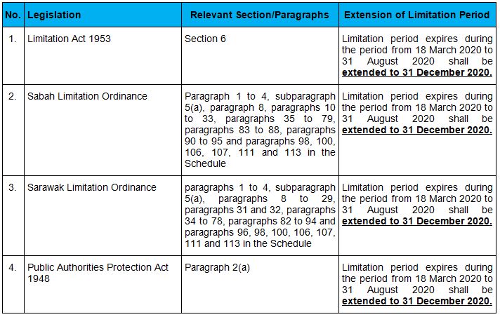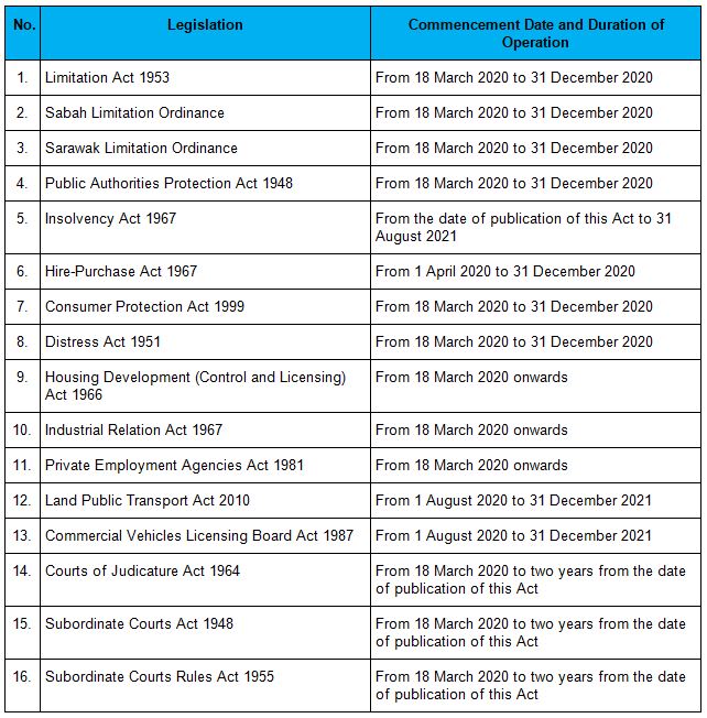3) This legal article will now provide a quick overview on the temporary reliefs accorded to the relevant legislations under the COVID-19 Act and the effective periods for such applications of such reliefs: