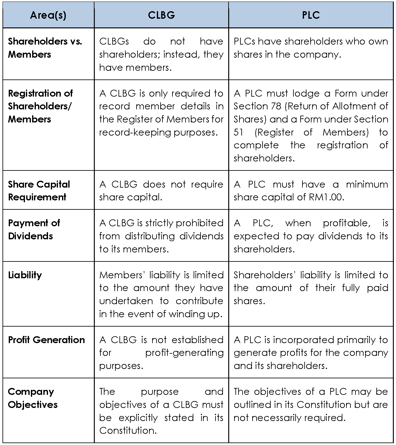 For ease of reference in examining the differences between a CLBG and a PLC, listed below are several areas that may be scrutinised. It is to be noted that the lists are non-exhaustive. The Company Secretary of the CLBG ought to check further to see whether the matter on hand will require approval from the Minister or Registrar before execution.