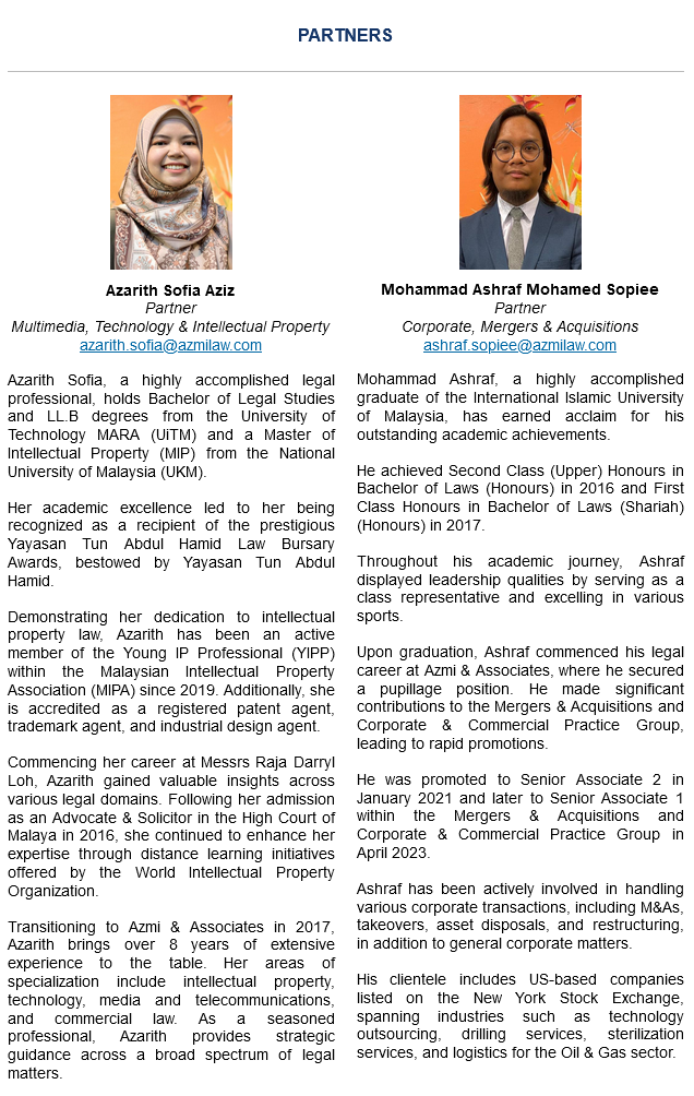 Azmi & Associates is excited to announce the elevation of Azarith Sofia Aziz and Mohammad Ashraf Mohamed Sopiee to Partner as of 1 May 2024.