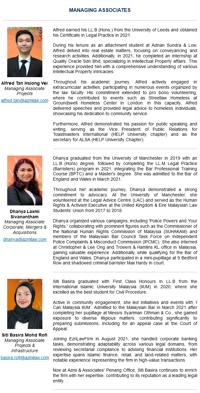 The newly appointed individuals will undoubtedly bring value to Azmi & Associates, advancing the Firm’s expansion and long-term viability in the legal industry.