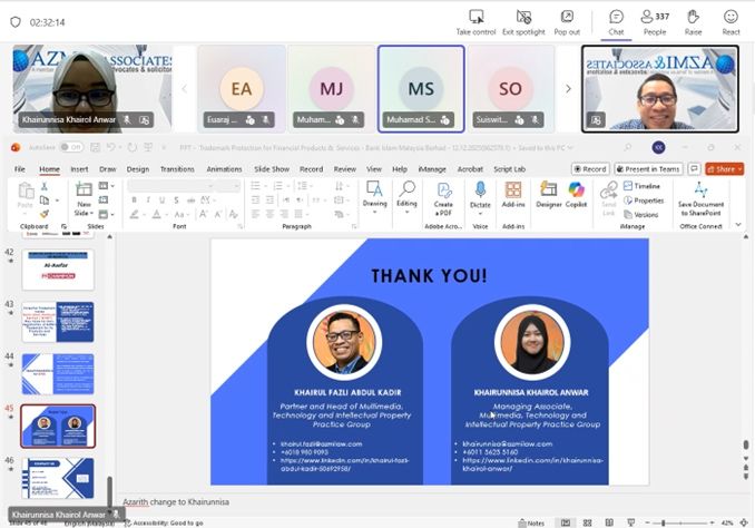 On 12 December 2025, our Multimedia, Technology & Intellectual Property team had the pleasure of conducting an online knowledge-sharing session on intellectual property (IP) titled “Solicitor’s Briefing: Trademark Protection for Financial Products & Services” for our client, Bank Islam Malaysia Berhad (BIMB). The session was delivered by Khairul Fazli Abdul Kadir (Partner) and Khairunnisa Khairol Anwar (Managing Associate).
