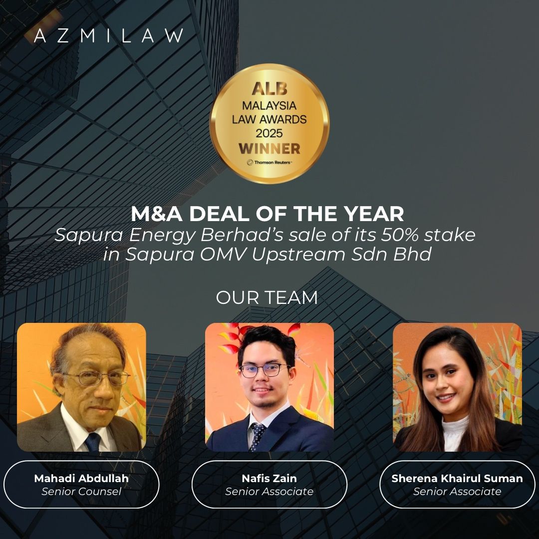 We also received the M&A Deal of the Year award for our role as legal counsel to Sapura Energy Berhad, via their English law external counsels, LXL London in the sale of its stake in SapuraOMV. Our team, comprising of Senior Counsel Mahadi Abdullah, and senior Associates, Nafis Zain and Sherena Khairul Suman provided legal support and advice on pre-emption rights between the parties under the PSC and delivered legal opinion for the PSC preemption right issues.
