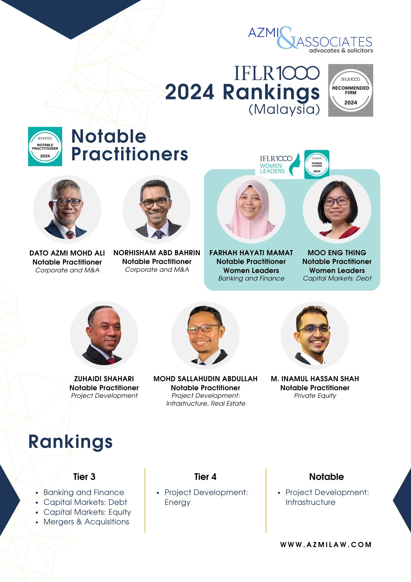 Azmi & Associates is pleased to announce its recognition in the IFLR1000 2024 Rankings (Malaysia) for its remarkable performance in Banking and Finance, Capital Markets, Mergers & Acquisitions, Project Development and other categories.