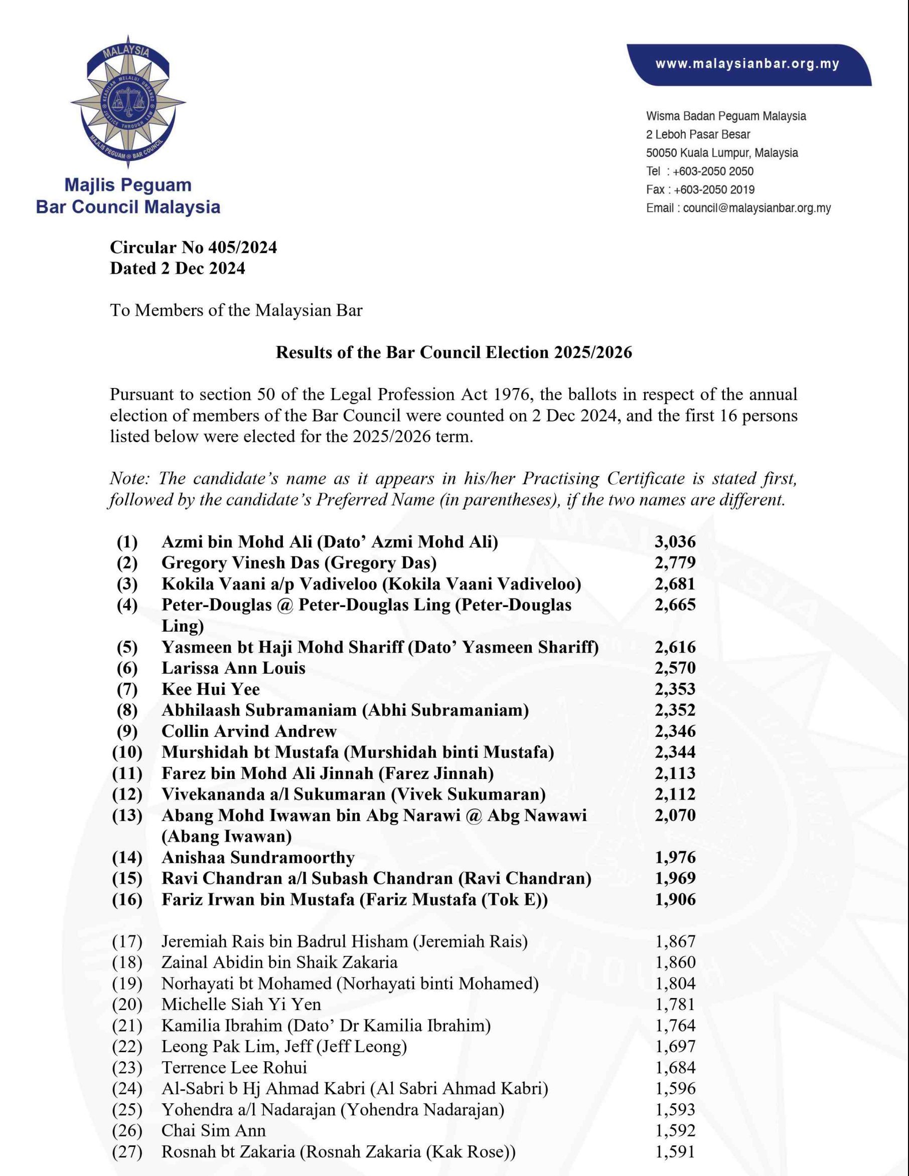 Azmi & Associates wishes to congratulate our Senior Partner, Dato’ Azmi Mohd Ali, on being one of the 16 elected councillors by the members of the Bar Council, on 2.12.2024, also by winning the highest number of votes amongst 42 contesting candidates.