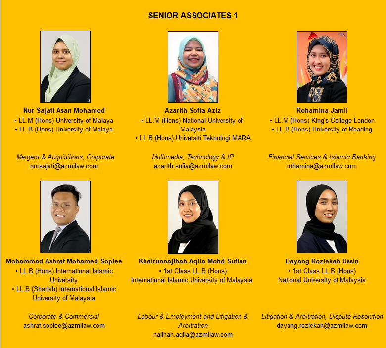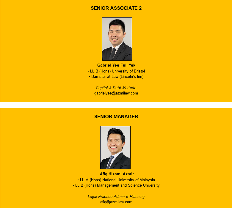 Warmest congratulations to the new senior associates and senior manager, whose promotions reflect the strong focus that Azmi & Associates places on developing its own talented employees and ensuring we have the right personnel in place to provide customised and comprehensive solutions for our clients.